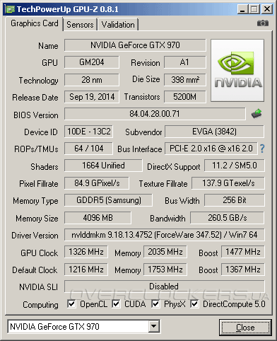 Вначале познакомимся с представителем серии GeForce GTX 970, который станет нашим подопытным. Это топовая версия GeForce GTX 970 в исполнении EVGA из линейки FTW. В числе главных отличительных качеств — мощный кулер ACX 2.0 и внушительный заводской разгон.