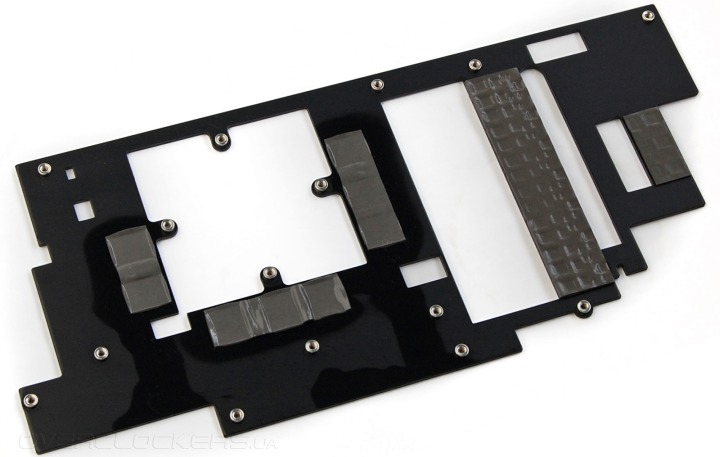 На плату прикручивается радиатор в виде пластины, накрывающей весь текстолит. Контакт с микросхемами памяти и силовыми элементами осуществляется через термопрокладки. Массивные габариты основного радиатора не позволяют использовать рифление и различные зубчики на поверхности такой пластины.