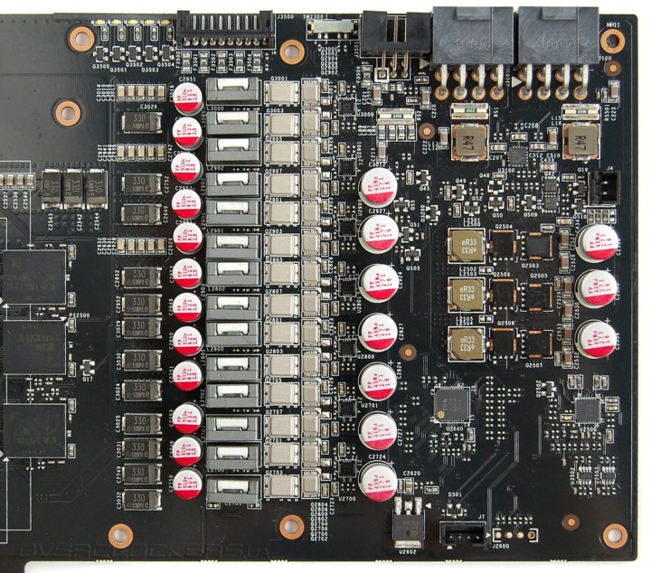 Система питания графического процессора насчитывает аж 14 фаз под управлением контроллера IR3595. Микросхемы GDDR5 запитаны от трех фаз. Используются самые передовые транзисторы в корпусе directFET.