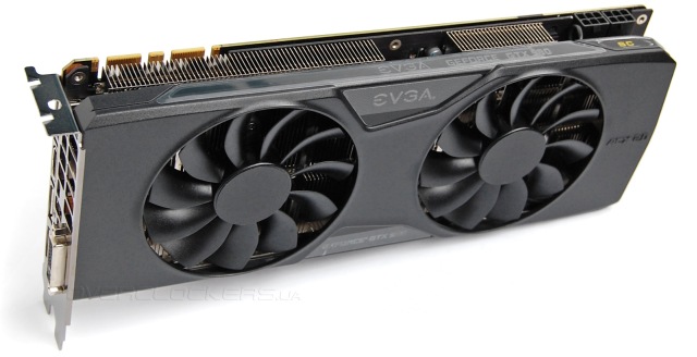 Визуально флагманская карта ничем не отличается от недавно рассмотренной EVGA GeForce GTX 970 FTW ACX 2.0 — двухслотовый кулер с не самыми крупными вентиляторами, одинаковый дизайн кожуха. Хотя реальные размеры больше — длина выросла до 27 сантиметров.