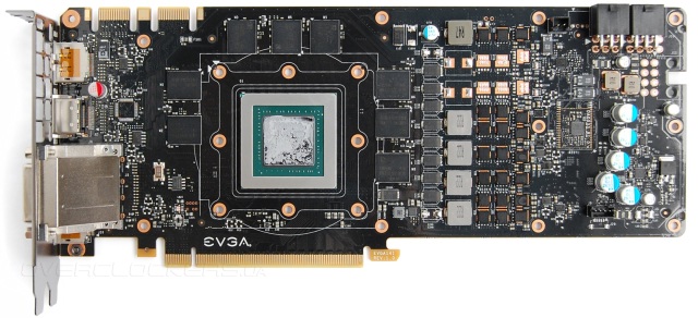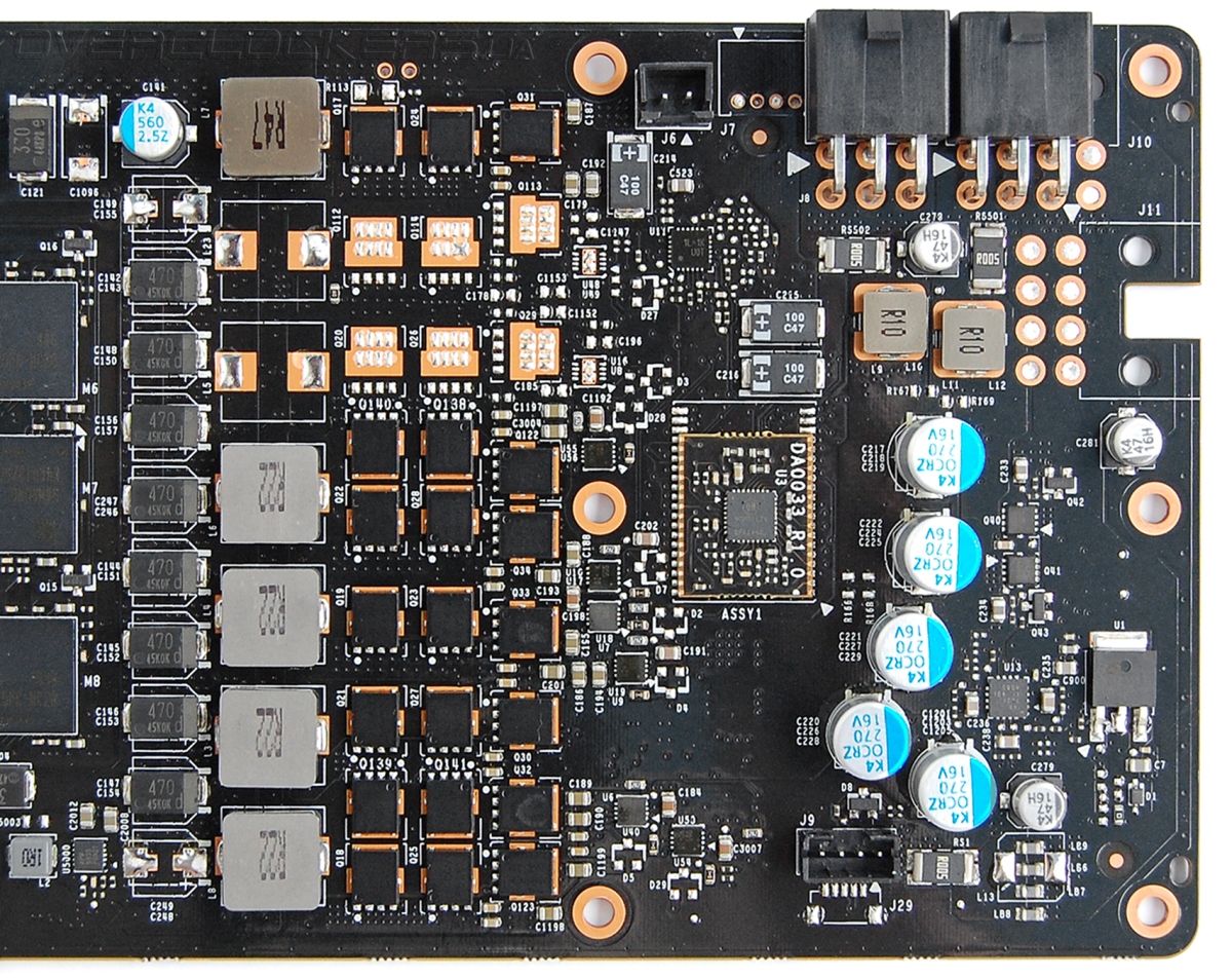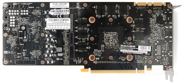 Печатная плата выполнена строго по референсному дизайну без каких-либо изменений. В районе узла питания можно наблюдать пустые места под не распаянные элементы, но точно такой же вид имеет эталонная карта GeForce GTX 980.