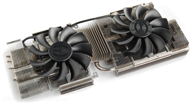При внешней простоте форм EVGA выглядит вполне солидно. Обращают на себя внимание вентиляторы с лопастями необычной формы.