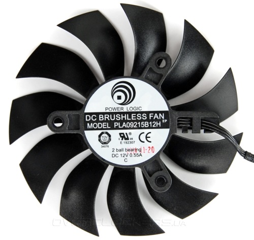 Обдувается конструкция парой вентиляторов Power Logic PLA09215B12H диаметром 92 мм (реальные размеры крыльчатки чуть меньше). Лопасти не имеют привычного выпуклого изгиба с внешней стороны. Нетрадиционный дизайн крыльчатки, соответствующий фирменной технологии Swept Fan Design, должен снизить уровень шума.