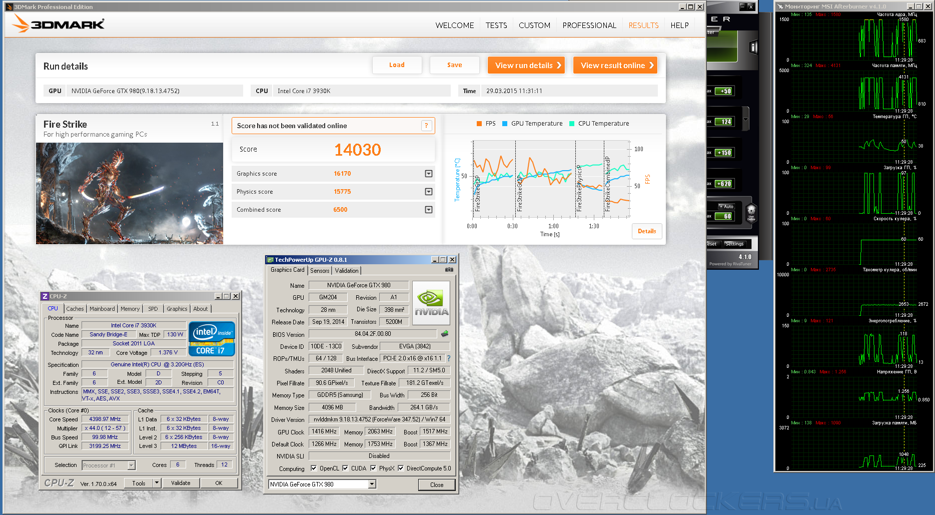 Компанией выпускается специализированная утилита EVGA Precision для мониторинга и разгона. Мы воспользовались более популярной программой MSI Afterburner. Особой разницы нет, поскольку функциональность у них одинаковая, отличается только внешний интерфейс. Использование референсного дизайна позволяет задействовать софтвольтмод, но это не обеспечило существенного рывка — частоты росли, стабильность нет. В итоге разгон остановился на отметке в 1396 МГц по базовой частоте при пиковом Boost 1535 МГц. Великолепный результат. Выше был только у Gigabyte GV-N980G1 Gaming-4GD. Память тоже приятно удивила, заработав на 8128 МГц.