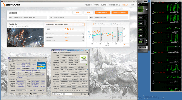 При игровой нагрузке пиковое значение Boost достигало отметки в 1405 МГц, и в некоторых играх ядро стабильно работало на такой частоте без просадок. Нижний левый скриншот демонстрирует данные мониторинга при тестировании в Assassin’s Creed: Unity и Far Cry 4. В первой игре наблюдались стабильные 1405 МГц, во второй были небольшие колебания с понижениями частоты до 1380 МГц. В Battlefield 4 наблюдались более существенные просадки, вплоть до 1354 МГц. Тем не менее, рабочие частоты GPU рекордные. По этому параметру EVGA Superclocked на первом месте среди всех рассмотренных ранее GeForce GTX 980.