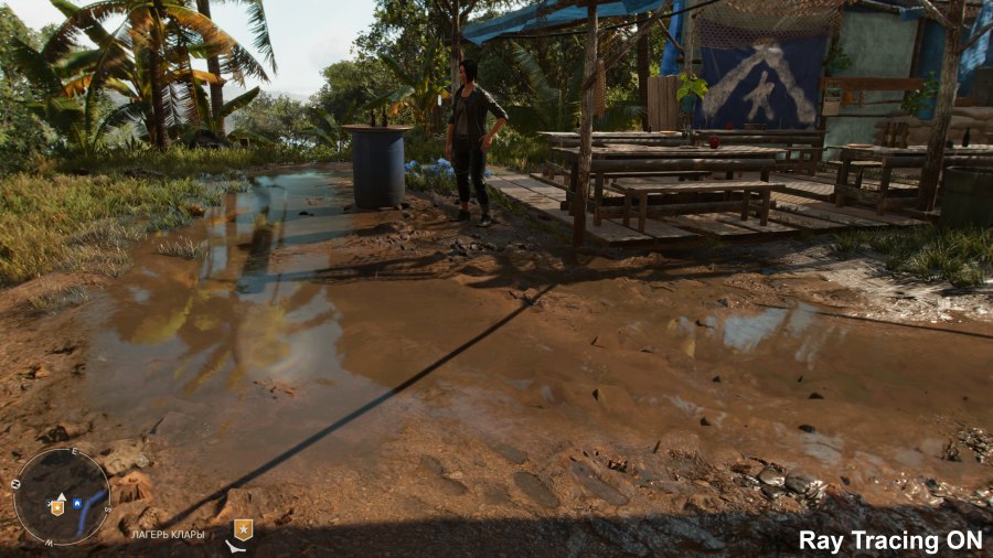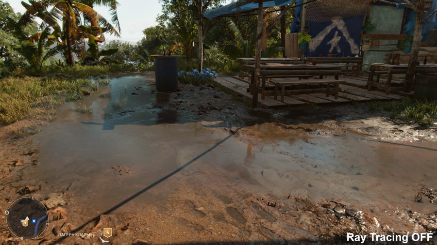 Сразу видна разница в отражениях на поверхности лужи. Также появляется более корректная сетчатая тень и вода имеет близкий к окружению оттенок, что придает картинке естественности. Детальнее о влиянии трассировки на картинку поговорим в отдельном обзоре.