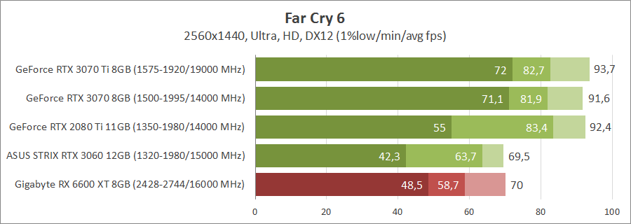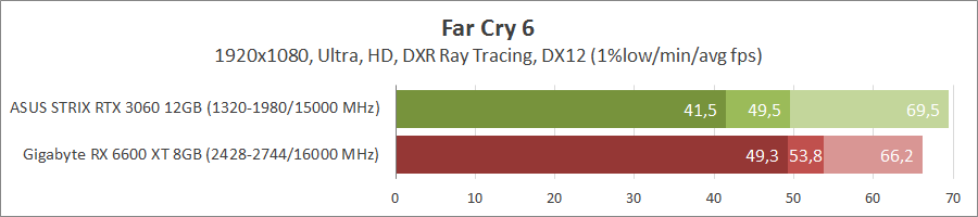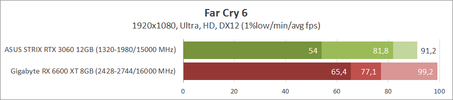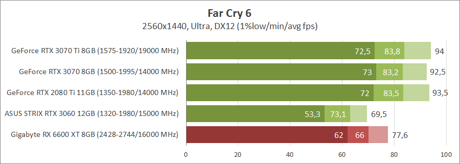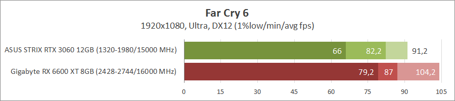 Средние показатели у GeForce RTX 3060 выше, но по минимальным выигрывает Radeon RX 6600 XT.
