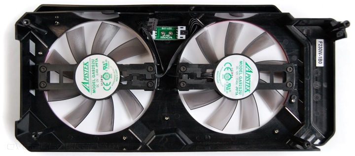 Пластиковый корпус легко снимается без повреждения пломбы, проблемы создает только короткий провод питания. Но при желании кожух снимается, и можно провести чистку карты от накопившейся пыли. Прямо на кожух крепятся два вентилятора Apistek GA92SU диаметром 92 мм.