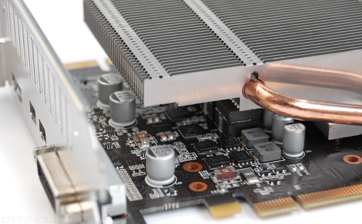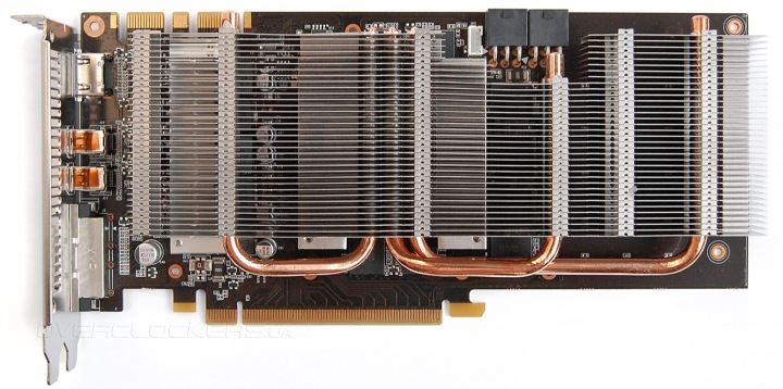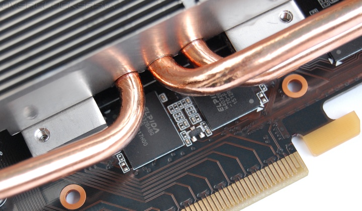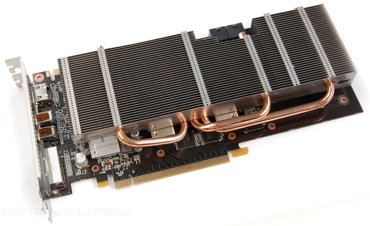Радиатор состоит из продольных пластин, которые пронизывают три тепловые трубки. Трубки сходятся в основании, где радиатор контактирует с графическим ядром.