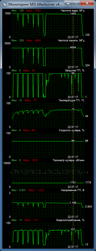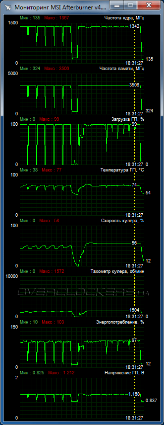 Во время экспериментов по разгону оказалось, что на данной видеокарте работает софтвольтмод, что бывает не у всех GeForce. Но тут уже не хватало запаса по мощности. Даже при повышении соответствующего лимита наблюдалось колебание частоты с просадками. Повышение напряжения на одно деление давало выигрыш менее 20 МГц по частоте ядра, а итоговые результаты не отличались от тех, что выдал Gainward Phoenix на стандартном напряжении и меньшем на 20 МГц разгоне.