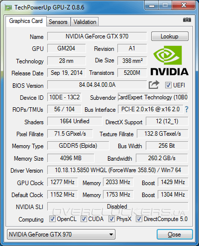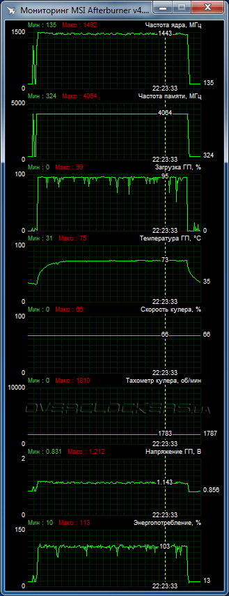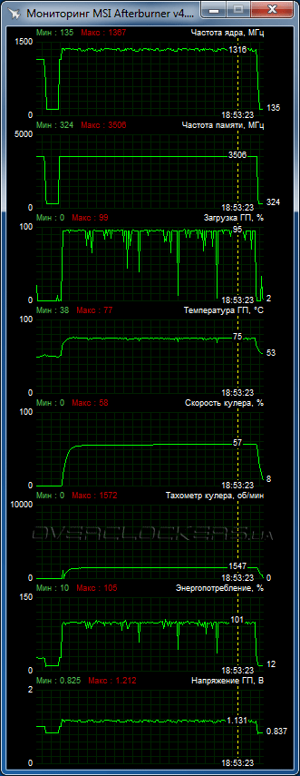При разгоне поддерживать начальный уровень рабочих температур удалось при небольшом повышении скорости вентиляторов до 1800 об/мин. Все еще невысокое значение, но шум выше ожидаемого. Требовательному пользователю будет неприятно работать в таких условиях, но рядовой игрок не почувствует особого дискомфорта. Так что разгонный потенциал Gainward GeForce GTX 970 Phoenix вполне реализуем без замены родного охлаждения.