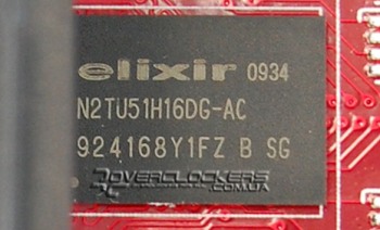 На плате распаяно 8 микросхем Elixir N2TU51H16DG-AC, рассчитанных на 800 МГц. Как и в случае с младшей картой это обычные чипы DDR2 SDRAM.
