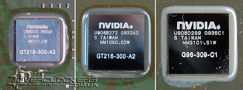 Внизу мы привели фотографию, на которой в одинаковом масштабе изображены GT216 и старый G96 (GeForce 9500 GT), что позволит вам наглядно оценить, насколько уменьшилась площадь кристалла у обновленного 40-нм ядра относительно 65-нм предшественника, даже с учетом возросшего числа транзисторов. Заодно, на этой же иллюстрации имеется и младший GT218 (крайний левый).
