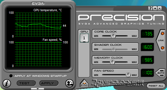 Для разгона можно пользоваться утилитой EVGA Precision или уже известным способом (дописав ID карты 0A20h в RivaTuner.cfg) активировать соответствующие функции в RivaTuner.