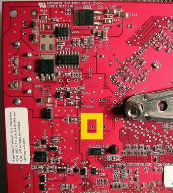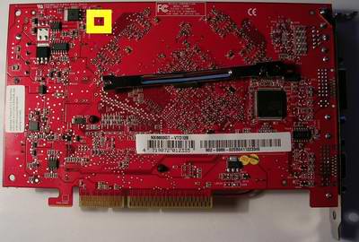 В начале необходимо измерить стандартное напряжение ядра вашей GF6600GT AGP. Для этого нужно поместить красный щуп (+) мультиметра на контакт, обведенный на фото желтым квадратом, а черный щуп (-) - на корпус.