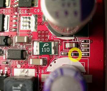 В 3D-режиме напряжение должно быть в районе 1,45В. Далее находим на видеокарте резистор, обведенный на фото желтым кругом: