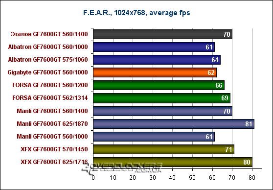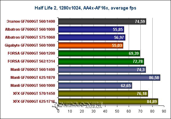 В качестве эталонной видеокарты на базе GeForce 7600GT выступала карта ASUS EN7600GT/2DHT/256M/A, имеющая стандартные частоты 560/700 (1400) МГц для чипа и памяти соответственно. Тестовые пакеты были ограничены всего тремя, а именно 3DMark06, F.E.A.R. и Half Life 2, которых было достаточно, чтобы определить разницу производительности между видеокартами. Настройки в синтетическом пакете не изменялись, в игре F.E.A.R. выставлялось разрешение 1024x768 с качеством графики High, в Half Life 2 - 1280ґ1024, качество графики максимальное, полноэкранное сглаживание - AA4x, анизотропная фильтрация - AF16x.