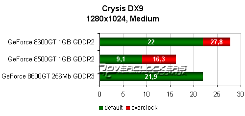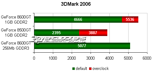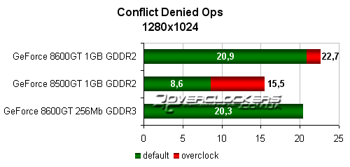 GeForce 8600GT с памятью GDDR2 уступает более быстрому аналогу, но только на 5%. Разгон помогает лишь на 11% обогнать GeForce 8600GT GDDR3 на рекомендованных частотах, что явно свидетельствует о том, что производительность снова упирается в невысокую пропускную способность памяти.