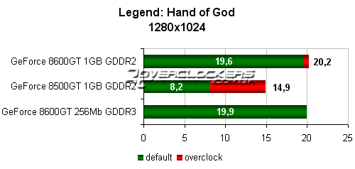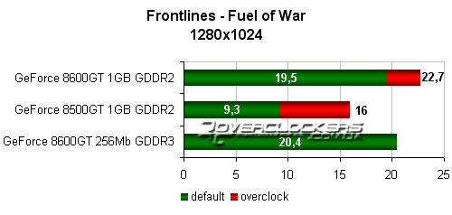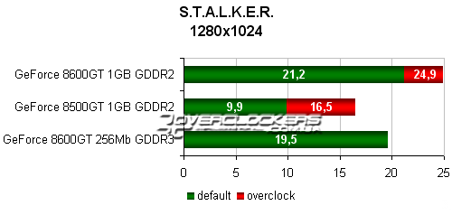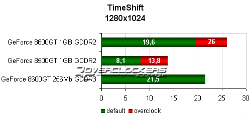 Большой объем видеопамяти не помогает GeForce 8500GT обеспечить более-менее приемлемую производительность в этом разрешении, хотя прирост от разгона составляет 70%. С GeForce 8600GT на этот раз все обстоит вполне логично – видеокарта с меньшими частотами отстает от своего более быстрого собрата.