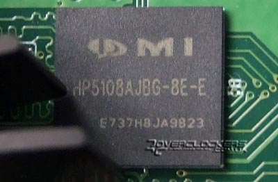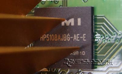 На плате распаяно 16 чипов памяти GDDR2 емкостью 64MB. Память от неизвестного производителя M1 с маркировкой HP5108AGBG-8E-E, и никаких данных по ней, честно говоря, выяснить не удалось.