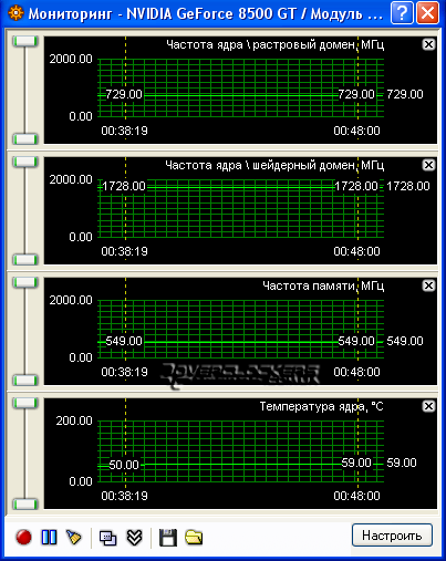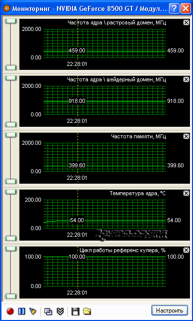 Память стабильно разогналась до 550 МГц, при более высоких частотах после прогрева начинали проявляться артефакты. Как видим, память полностью аналогична той, что установлена на предыдущей плате. Можно предположить, что время доступа у данных чипов (и у памяти на GeForce 8500GT) 2 нс. Но в отличие от предыдущей видеокарты, у данной модели память проявляла признаки перегрева в виде редких артефактов даже на частоте 550 МГц (1100 МГц). Правда, это проявлялось лишь после получасового интенсивного теста. Для стабильности работы и улучшения охлаждения, обороты вентилятора были повышены до 50%, и это решило проблему с перегревом. Графическое ядро удалось разогнать до 720/1728 МГц (чип/шейдерный домен). При 50% оборотах вентилятора ядро не разогревалось более 58°C.
