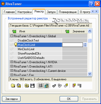 Разгон осуществлялся с помощью утилиты RivaTuner 2.08. Своими возможностями видеокарта порадовала. Память без проблем работала на частоте 550 МГц (1100 МГц). А вот разгон ядра уперся в граничное значение шкалы RivaTuner. Утилита не позволяла поднять частоту выше 690 МГц, а у ядра еще явно был потенциал. Предельное значение можно регулировать в ветке реестра Overclocking\Global\MaxClockLimit.