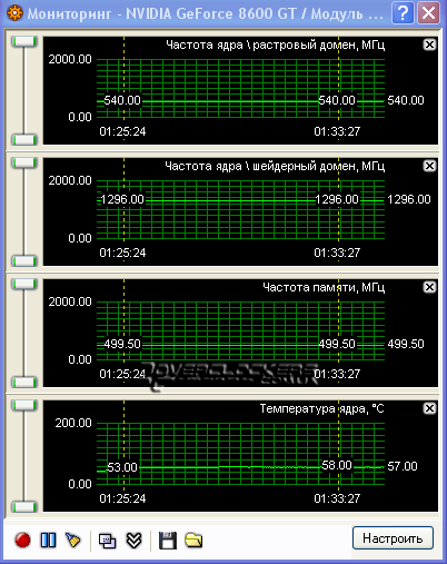 Для тестов мы остановились на частотах – 720/1728/550 МГц. Прирост от разгона ядра – 33%, памяти – 10%. По частотам ядра удалось превысить частоту старшей модели GeForce 8600GTS, но вряд ли стоит надеяться на аналогичную производительность при частоте памяти 1,1 ГГц в сравнении с 2 ГГц у GeForce 8600GTS.