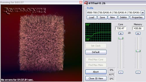 Вспоминая высокие частоты GeForce 8600GT/GTS можно надеяться на неплохой разгон видеоядра. Для оверклокинга использовалась программа ATITool. В этой же утилите проводилось и тестирование на стабильность работы при повышенных частотах. Частота памяти достигла стабильных 430 (860) МГц, что не является выдающимся результатом, но для данной памяти вполне нормальный результат без поднятия напряжения. Чип смог разогнаться до 750 МГц, но из-за нестабильной работы пришлось ограничиться значением в 730 МГц. Таким образом, прирост частоты составил 7,5% по памяти и целых 57% по чипу!