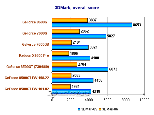 Как видно на диаграмме, в 2005 "марке" GeForce 8500GT показывает полное преимущество над 1600Pro и 7600GS, в 2006 уступает варианту NVidia в лице чипсета прошлого поколения. Новые драйвера дают прирост около 5 %. Отрыв старшего брата на G84, 8600GT, почти в два раза больше. Это и неудивительно, ведь универсальных конвейеров и текстурных блоков на 8500GT ровно в два раза меньше. Зато с разгоном показатели стремятся к результату 7600GT, и в 3DMark 2005 даже обгоняют ее. Прирост от разгона 30-35 %, что довольно неплохо. Но достойные результаты в синтетических тестах могут обернуться провалом в игровых, как это было с GeForce 8600GT.