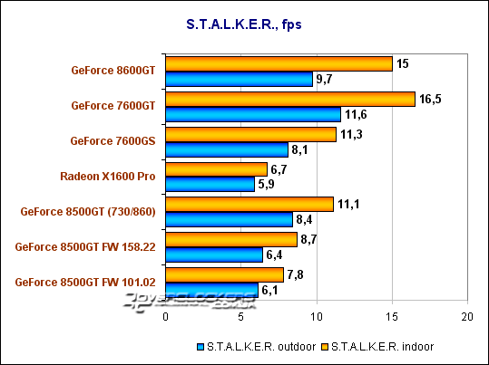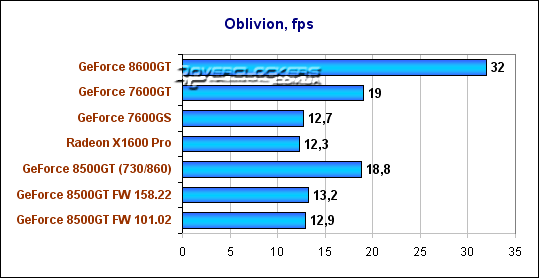 GeForce 8500GT легко обходит Radeon Х1600Pro, но GeForce 7600GS удается догнать только с разгоном. Сам же разгон в этой игре дает прирост около 30%, да и новый драйвер прилично поднимает результат.