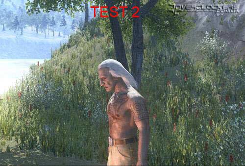 Следующая игра - Call of Juarez. Движок игры активно использует шейдеры 3-й версии и HDR-освещение. В этом приложении проводились два теста. Первый - на игровой локации внутри поместья (последний эпизод игры). Второй тест - это IX эпизод игры, около вигвама старого индейца. Обилие в кадре буйной растительности заставляет частоту кадров падать до минимума. Это самый красивый уровень в игре, который загружает видеокарту по максимуму.