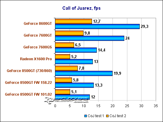 В этой игре 8500GT держится довольно неплохо, показывая небольшое преимущество над Х1600 и 7600GS. А с разгоном почти достигает уровня 7600GT. Прирост производительности от разгона составляет 42%. Как видно по диаграмме новая архитектура 8-й серии имеет весомое преимущество над старыми картами NVidia в данной игре.