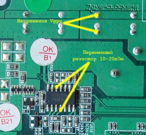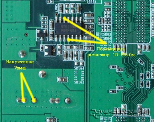 Ну что ж, трудности нас не пугают. Поэтому, произнесши заветную мантру «Во имя Сталкера, Кризиса и Девил Мэй Края. Паяй!» и, достав друга оверклокера – паяльник, мы приступили к делу. В качестве баллонов с закисью азота используем переменные резисторы номиналом 10-20 кОм. За топливную систему отвечают два стабилизатора Richtek RT9259A расположенные на обратной стороне платы. Один из них за питание чипа, второй за питание памяти. Для повышения напряжения питания необходимо зашунтировать переменным резистором 4 и 12 ножки микросхемы (отсчет против часовой стрелки от помеченной ножки).