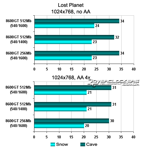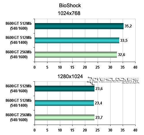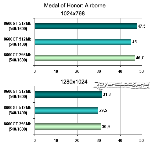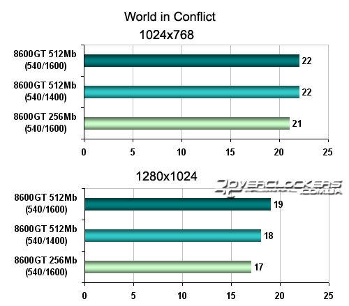 Изначально GeForce 8600GT 256 MB немного обгоняет видеокарту с большим объемом памяти. Но разгон это компенсирует и даже дает небольшой прирост. Правда прирост в 1% вполне можно списать и на погрешность. Но в любом случае, быстродействие в этой игре порадовало, поскольку в обоих разрешениях видеокарты показали высокий игровой fps.