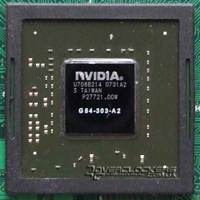 На плате установлен чип G84 ревизии А2. Вокруг него расположена пластиковая рамка для защиты кристалла от скола.