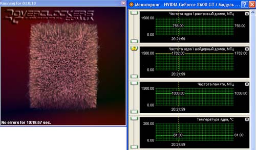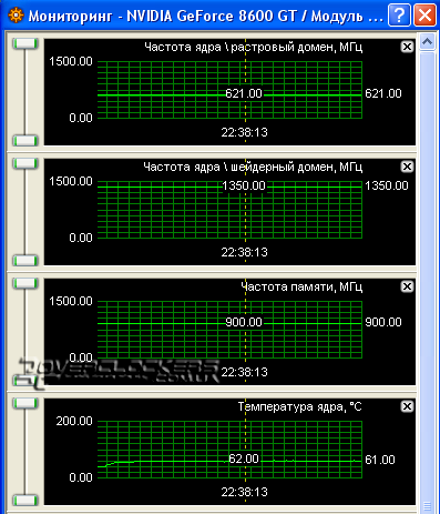 Для мониторинга использовалась последняя версия утилиты RivaTuner 2.06. Реальная частота чипа 621 МГц, при этом шейдерный домен работает на 1350 МГц. Под нагрузкой температура чипа не поднимается выше 62 °С, что является довольно низкой температурой для G84 при таком режиме. Как видим, родная система охлаждения очень эффективная.