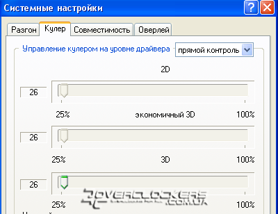 Но самое интересное, что оборотами вентилятора можно управлять, несмотря на то, что разъем двухпиновый. А вот отслеживать обороты нам не удастся, поскольку таходатчика, естественно, у вентилятора нет. Если верить данным в соответствующей вкладке RivaTuner, то изначально вентилятор работает примерно на 25 %. Напряжение, подаваемое на вентилятор, принимает несколько дискретных значений с шагом примерно в 7%. О повышении оборотов явно свидетельствует увеличение шума и снижение температуры.