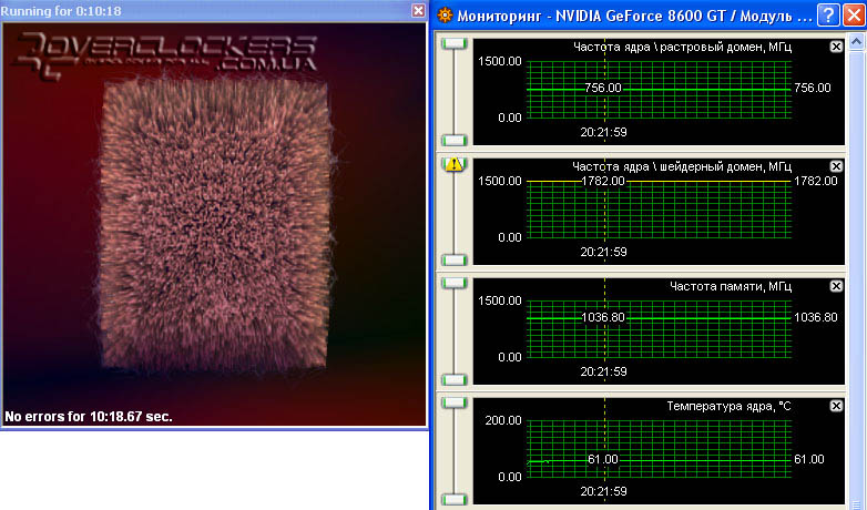 Однако всегда хочется большего, а эта возможность есть. С последними драйверами в RivaTuner появляется возможность раздельно регулировать частоту ядра и его шейдерного домена. Зафиксировав частоту на 756 МГц, оказалось, что шейдерный домен еще работал на частотах чуть ли не в 1,95 ГГц. Шаг изменения его частоты равен 54 МГц. При частоте 1782 МГц тест в ATITool проходил без проблем. Но вот при повышении частоты проявлялись небольшие артефакты. На частоте 1836 МГц появлялось по нескольку желтых точек, которые, впрочем, не фиксировал счетчик артефактов ATITool.