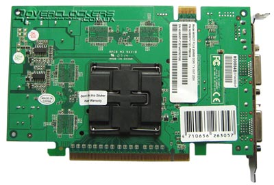 Система охлаждения отличается от референсной. Кулер аналогичен по конструкции системам охлаждения, устанавливаемым на карты GeForce 7600 и GeForce 7900 от Palit и XpertVision. Кроме охлаждения чипа, воздушный поток, создаваемый вентилятором, обдувает память. Кулер крепится на защелках к пластине, расположенной на обратной стороне. На этой пластине находится гарантийная пломба, поэтому замена системы охлаждения без повреждения стикера, а, следовательно, и потери гарантии, невозможна. Пластина прижимается к плате через поролоновую прокладку. Насколько эта система охлаждения эффективна, мы увидим ниже.