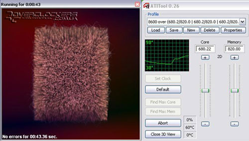 И, естественно, без разгона не обошлось. Утилита RivaTuner FR не определил карту, поэтому пришлось воспользоваться ATITool, в которой, заодно, проводилось и тестирование на стабильность в "волосатом кубе". Верхним пределом стабильной работы памяти была частота около 860 МГц. Но при хорошем прогреве в тестах, появлялись артефакты. Пришлось постепенно понижать частоту. Таким образом, были достигнуты 820 (1640) МГц, при которых память работала идеально. Ядру покорилась частота в 730МГц, но из-за нестабильной работы пришлось ограничиться значением 680. Хотелось остановиться на круглой цифре "700", но карта иногда зависала в тестах.