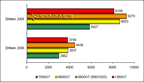 Как видно, GeForce 8600GT демонстрирует преимущество над Radeon 1950GT, которое с разгоном только увеличивается. Но на номинальных частотах преимущество составляет 6% в 2005 "марке" и всего 1% в 2006. Разгон дает прирост в 7% и 15% соответственно.