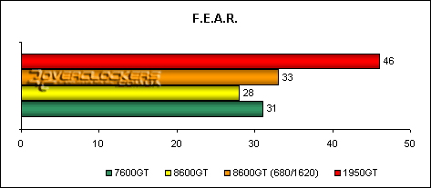 Radeon 1950GT опять в лидерах, отставание GeForce 8600GT составляет 8-10%. Но с разгоном, карта наконец-то вырывается вперед, демонстрируя преимущество в 21% по сравнению со стандартными частотами и 10-12% над Radeon.