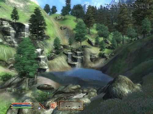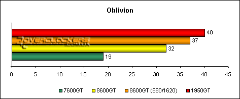 Следующая игра, Oblivion, хоть и вышла более года назад, но до сих пор поражает своими красивыми пейзажами и визуальными эффектами. Тестирование производилось на открытой местности. Данные производительности снимались Fraps'ом во время небольшой прогулки около водопадов, среди обильной густой травы и деревьев.