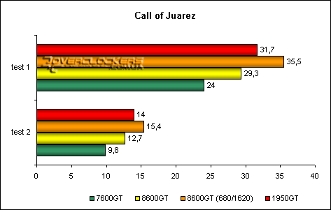 Call of Juarez, в технологическом плане, игра тяжелая. Она активно использует шейдеры 3-й версии и способна поставить на колени даже самый мощный видеоакселератор. В этой игре проводились два теста. Первый - на игровой локации внутри поместья (последний эпизод игры). Второй тест - это IX эпизод игры, около вигвама старого индейца. Обилие в кадре буйной растительности заставляет фреймрейт падать до минимальной отметки. Это один из самых красивых уровней в игре, но и самый тяжелый для видеокарты.