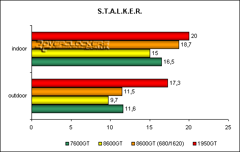 Последний тест, в игре S.T.A.L.K.E.R., наиболее интересен. Игра вызвала много споров не только своим содержанием и игровым процессом, но и высокими системными требованиями. Хотя движок игры отлично масштабируется, но при включении всех эффектов, даже High-End акселераторы показывают невысокую производительность. При тестировании, в игре было выставлено разрешение 1280х1024, полное динамическое освещение, включены все тени, ползунки качества текстур и теней выкручены на максимум, AF16x и AA отключен. Картинка конечно великолепна, но невысокая производительность не особо радует. Для объективности, тестирование проводилось в помещении и на открытой местности.
