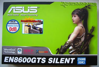 ASUS EN8600GTS Silent поставляется в коробке огромных размеров, на которой особо отмечена бесшумность данной карты, а также то, что ее система охлаждения эффективнее на 5 градусов, чем стандартный кулер. Кроме этого, четко указан объем памяти на видеокарте.