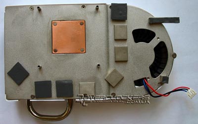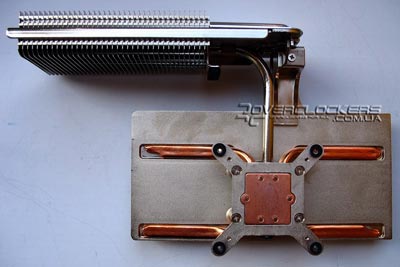 Здесь применена стандартная в последнее время схема - алюминиевый радиатор и тепловая трубка, которая пропущена через медный сердечник, контактирующий с ядром видеокарты.