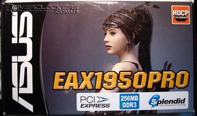 Перейдем к описанию ASUS EAX1950Pro. Коробка по размерам гораздо меньше, чем та, в которой поставляется ASUS EN8600GTS, но слегка больше, чем коробка от Palit 1950GT Super. На ней крупным шрифтом написано название видеокарты, а также объем памяти.