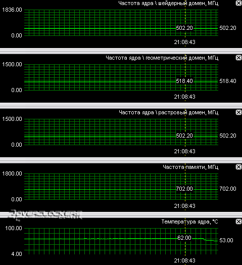 | XpertVision 7900GS Sonic 256Mb | 500(518)/1400 | 607(624)/1686 |