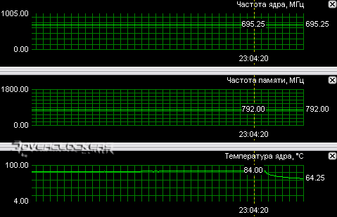 84 градуса – чип X1800XT действительно греется очень сильно, хотя эта температура еще не критична, конечно. Но, учитывая то, что кулер этой видеокарты не выдувает воздух за пределы системного блока, все-таки хотелось бы, чтобы температура видеокарты была пониже. С другой стороны, радует, что с шумом никаких проблем нет. Можно подытожить, что кулера ASUS EAX1800XT TOP вполне хватает для охлаждения этого видеоакселератора, но вот дополнительный разгон без каких-либо модификаций системы охлаждения ему противопоказан.